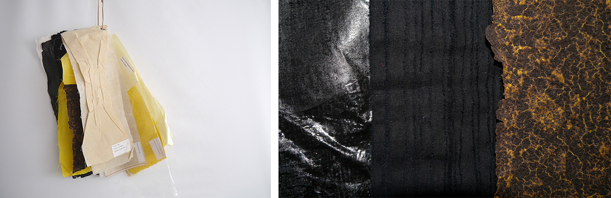 Teintures naturelles de sureau, de curcuma, de carotte et tissu blanc et noir Enduction de liant acrylique et marc de café, de sac plastique, de paraffine polie, de cire d’abeille et de peinture acrylique jaune Tessellation de bandes de tissu noires cousues sur un tissu blanc et canadian smock